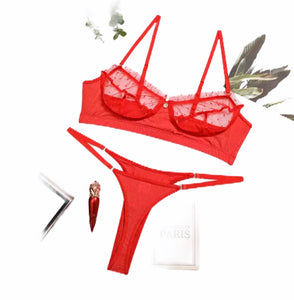 Set lencería semi transparente con detalle metálico rojo