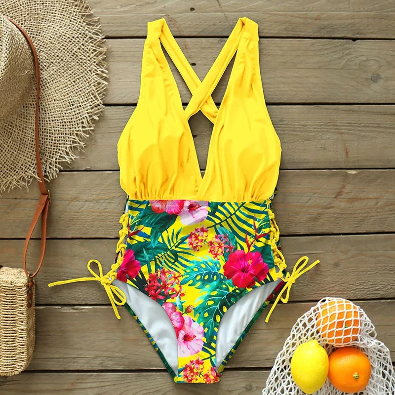 Traje de baño completo bicolor amarillo flores