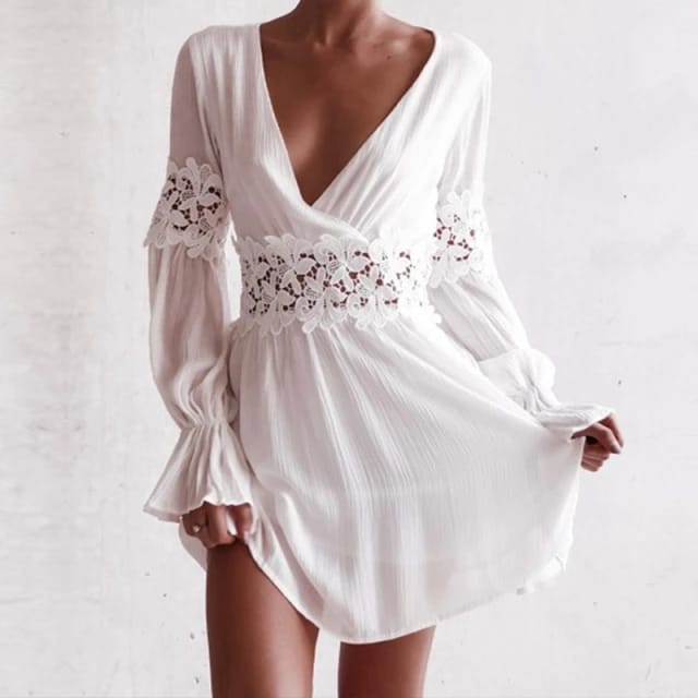 Vestido para Playa~ Blanco Manga Larga con Encaje Flores